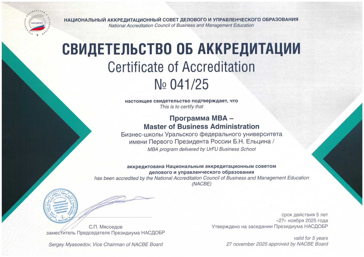 МВА Бизнес-школы УрФУ получила Аккредитацию НАСДОБР - Национального Аккредитационного Совета делового образования!